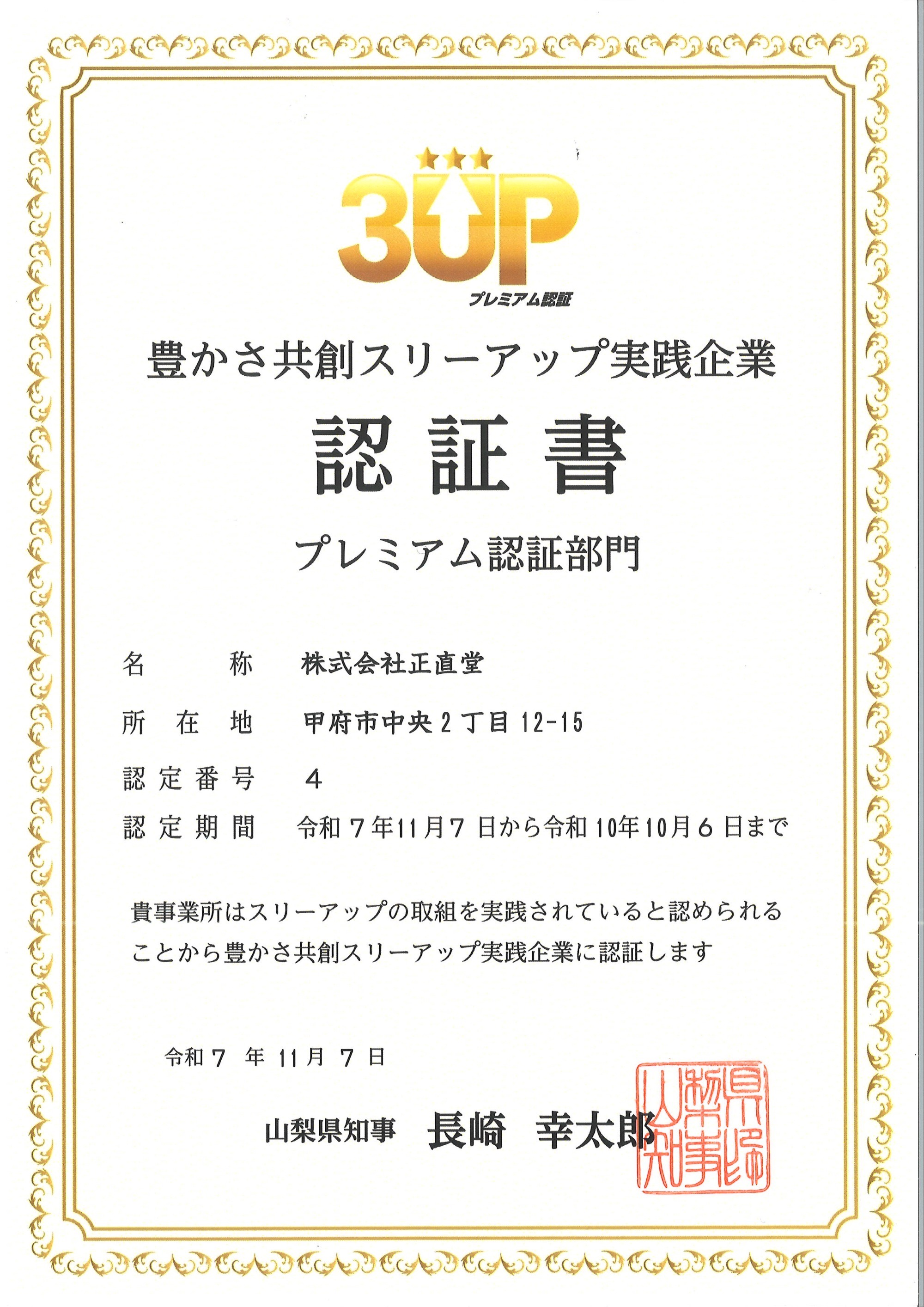 このたび当社は、豊かさ共創スリーアップ実践企業「プレミアム認証部門」 に認証されました。